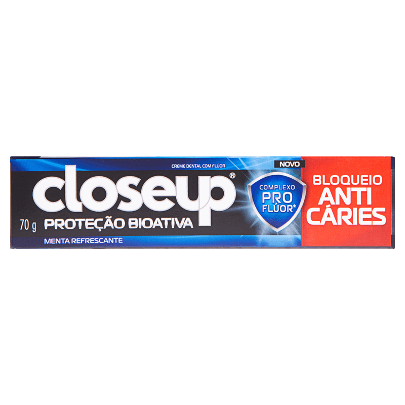 Closeup Proteção Bioativa Bloqueio Anticáries combate previamente o aparecimento de cáries Possui uma fórmula inteligente que ajuda a fortalecer os dentes Ajuda a recuperar os minerais dos dentes Seu complexo Pró-Flúor* atua em toda a extensão dos dentes Proporciona 12 horas de proteção para dentes mais fortes Sabor menta refrescante