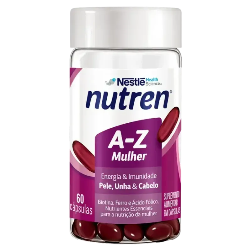 O Nutren Mulher A-Z é um suplemento alimentar multivitamínico e mineral em cápsulas formulado com Biotina, Ferro, Ácido Fólico e outras vitaminas e minerais de A a Z essenciais para a nutrição feminina, sistema imune e metabolismo, bem como manutenção das unhas, cabelo e pele.