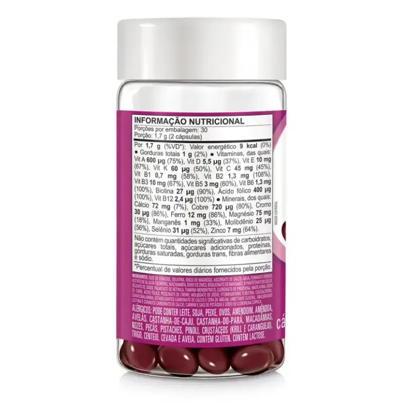 Óleo de girassol, gelatina, óxido de magnésio, ascorbato de cálcio, água, fumarato ferroso, acetato deDL-alfa-tocoferol, niacinamida, óxido de zinco, bisglicinato de manganês, D-pantotenato de cálcio,selenito de sódio, palmitato de retinila, tiamina mononitrato, cloridrato de piridoxina, riboflavina, óxidode cobre, ácido fólico, picolinato de cromo, molibdato de sódio, fitomenadiona, D-biotina,colecalciferol, cianocobalamina, estabilizantes carbonato de cálcio e cera de abelha, umectanteglicerol, emulsificante lecitina e corantes carbonato de cálcio, carmim e sais de potássio e sódio declorofilina cúprica.