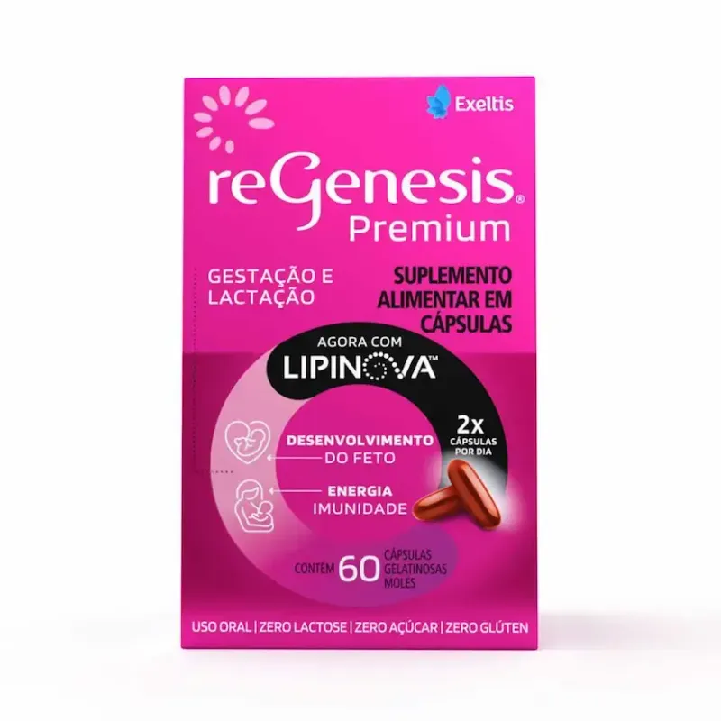 Regenesis Premium é um suplemento alimentar em cápsulas voltado para gestantes. É rico em Metilfolato (a forma ativa do ácido fólico), que auxilia na formação do tubo neural do feto durante a gravidez, contribuindo para o desenvolvimento saudável do organismo do futuro bebê. Também contém selênio, um antioxidante que auxilia na proteção dos danos causados pelos radicais livres.