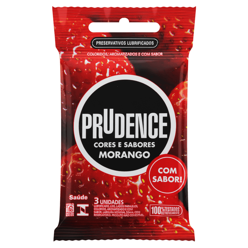 Coloca Morango que fica tudo mais gostoso. O Preservativo Prudence Morango tem cor vermelha, aroma e gostinho de morango para deixar seu momento íntimo ainda mais divertido, saindo da rotina e tornando tudo ainda mais prazeroso. Largura nominal de 52mm. Produto sem textura e com lados paralelos. Contém 3 Unidades. Todos os Preservativos Prudence são fabricados com látex natural e lubrificados à base de silicone, além de serem 3x testados, garantindo proteção e segurança e suas relações.