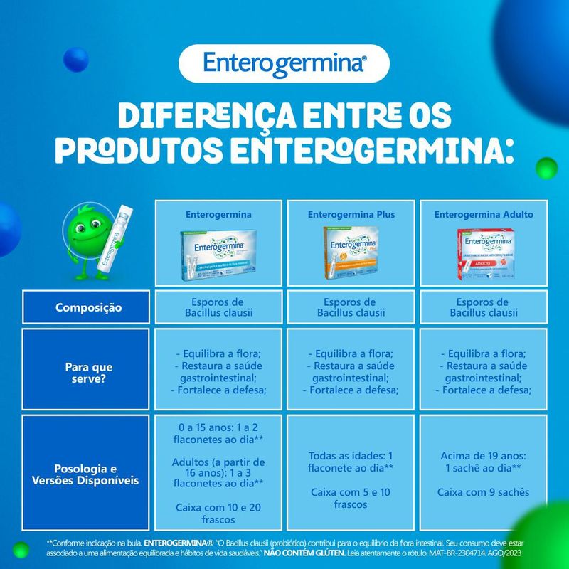 Enterogermina é um alimento probiótico constituído por 2 bilhões de esporos de Bacillus clausii e sua dose recomendada é de 1 a 3 flaconetes ao dia. Enquanto Enterogermina Plus é constituído por 4 bilhões de esporos de Bacillus clausii e sua dose recomendada é de 1 flaconete ao dia.