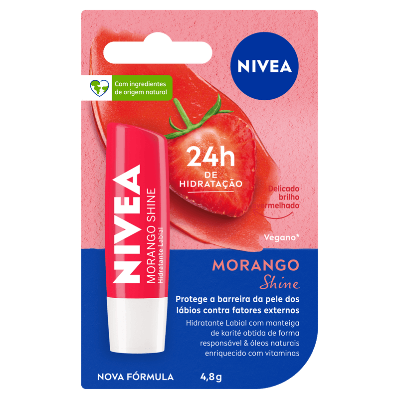 Hidratante labial. NIVEA Shine oferece cuidado e proteção por 24 horas, hidratando e proporcionando brilho delicado aos lábios.
