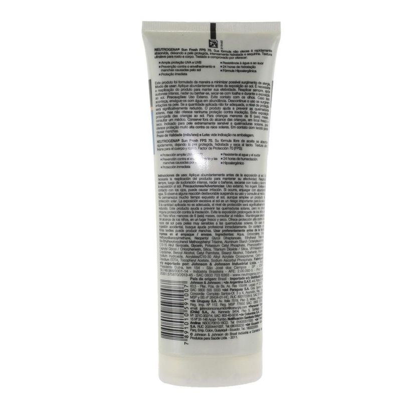 Neutrogena Sun Fresh FPS 70 é um protetor solar corporal com fórmula ultraleve que hidrata e protege a pele dos raios UVA/UVB. Indicado para todos os tipos de pele, inclusive as oleosas e as mais sensíveis, ajuda a prevenir o envelhecimento precoce e as manchas causadas pelo sol, mantendo a pele protegida, hidratada e sequinha. É altamente resistente à água e ao suor.