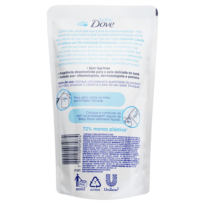REFIL SABONETE LÍQUIDO DOVE BABY HIDRATAÇÃO ENRIQUECIDA 180MLDove Baby Hidratação Enriquecida é um sabonete líquido infantil que também pode ser usado como shampoo. Desenvolvido especialmente para os bebês, inclusive recém-nascidos, ele limpa, hidrata e perfuma suavemente a pele delicada das crianças, sem irritar os olhos.Com fórmula hipoalergênica e testada por oftalmologistas, dermatologistas e pediatras, o sabonete líquido Dove Baby pode ser usado diariamente.A versão Refil do Sabonete Líquido Dove Baby Hidratação Enriquecida pode ser utilizada para repor a embalagem original da Dove ou qualquer outro compartimento específico para sabonete líquido.Benefícios e diferenciaisFoi desenvolvido especialmente para limpar e cuidar da pele delicada dos bebês.Com perfume suave.Pode ser usado como shampoo.Não irrita os olhos.Suave para uso em recém-nascidos.Com fórmula hipoalergênica e pH neutro, pode ser usado diariamente.Testado por oftalmologistas, dermatologistas e pediatras.uso: Molhe a pele do bebê com água morna.Aplique uma pequena quantidade do sabonete líquido Dove Baby nas suas mãos e passe pelo corpinho do bebê, ensaboando-o gentilmente da cabeça aos pés.Enxágue em seguida.É ideal para uso diário.IngredientesAqua, Glycerin, Cocamidopropyl Betaine, Sodium Cocoyl Glycinate, Polyacrylate-33, Parfum, Phenoxyethanol, Stearic Acid, Sodium Lauroyl Isethionate, Caprylyl Glycol, Lauric Acid, Styrene/acrylates Copolymer, Sodium Hydroxide, Sodium Tallowate, Tetrasodium Edta, Sodium Isethionate, Sodium Stearate, Etidronic Acid, Sodium Cocoate, Sodium Palm Kernelate.AdvertênciaUso externo.Não ingerir.Caso haja contato com os olhos, lave-os abundantemente.Se houver irritação, suspenda o uso imediatamente e procure orientação médica.Mantenha fora do alcance das crianças.