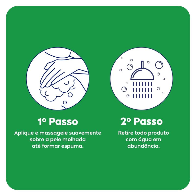 Massageie suavemente sobre a pele molhada até formar espuma. Retire todo o produto com água em abundância. Uso externo. Evite contato direto com os olhos. Caso aconteça, enxague com água em abundância. Em caso de irritação, suspenda o uso e procure orientação médica. Manter em local seco e arejado, ao abrigo de luz e fora do alcance de crianças.