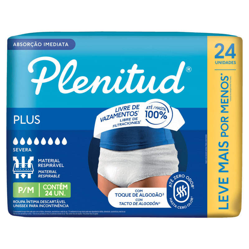 Roupa Íntima Plenitud Protec Plus é uma roupa íntima descartável pronta para usar, com alta absorção para incontinência urinária moderada a intensa em um formato fácil de vestir e tirar. Foi desenvolvida para proporcionar mais praticidade no momento da troca, além de oferecer maior conforto para o dia-a-dia.