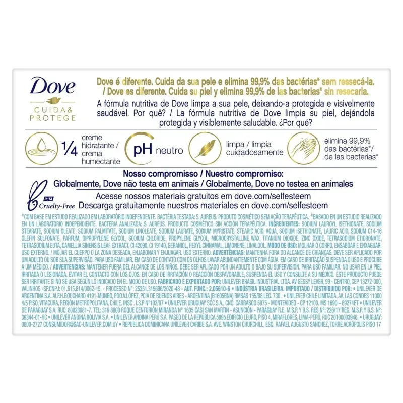 Com a junção da tecnologia Antibacteriana e a exclusiva Nutrium Moisture, Dove Cuida & Protege elimina até 99.9% das bactérias, enquanto suaviza a secura da pele e proporciona uma pele protegida a cada lavagem. Para uso diário.