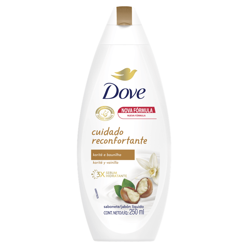 O Sabonete Líquido Dove Cuidado Reconfortante Karité e Baunilha é suave e hidratante, ajudando a sua pele a manter sua hidratação natural enquanto você toma banho. Ele limpa e nutre a pele, além de te fazer relaxar com uma deliciosa fragrância de karité e baunilha. O Sabonete Líquido Dove Cuidado Reconfortante é feito com Sérum Hidratante 3X*, agentes de limpeza suave e fórmula nutritiva de Dove, deixando sua pele macia e radiante. Este sabonete líquido conta com combinação de 3 ingredientes hidratantes para uma pele hidratada por 24 horas, além de ser dermatologicamente testado.