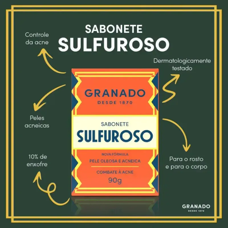 O Sabonete Granado Sulfuroso Enxofre 10% é ideal para a limpeza do rosto que sofre com acne. Também é indicado para reduzir o excesso de oleosidade do couro cabeludo (com alto grau de oleosidade). Contém 10% de enxofre, e é livre de parabenos e ingredientes de origem animal.