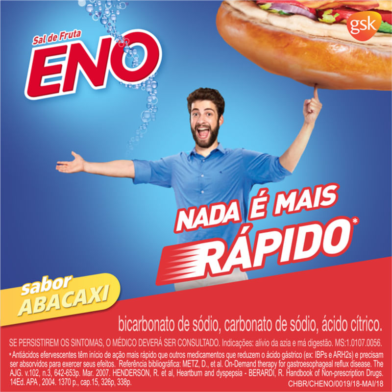 Os componentes do Sal de Frutas Eno quando dissolvidos em água, reagem entre si, produzindo um sal de efeito antiácido, capaz de iniciar a redução da acidez do estômago em 6 segundos.