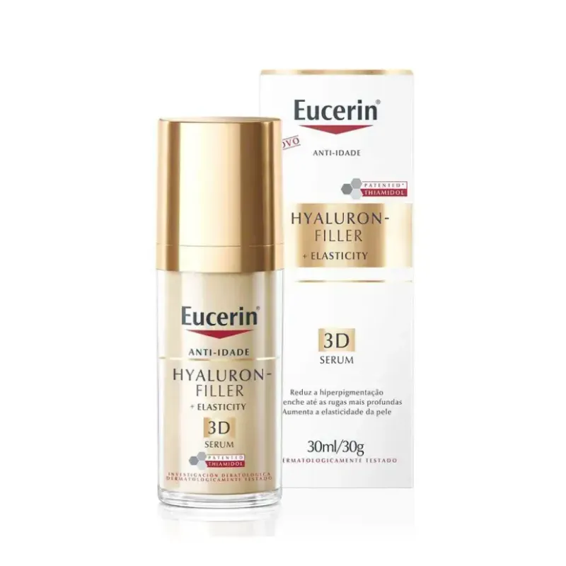 O Sérum Facial Antirrugas Eucerin Hyaluron-Filler Elasticity 3D age intensamente na redução de rugas, controle de flacidez e hiperpigmentação. Cuidadosamente formulado com uma combinação de Ácido Hialurônico, Thiamidol patenteado Eucerin e Arctiin, ele proporciona redução das rugas profundas, melhora na densidade e volume da pele, aumenta o colágeno e diminui as manchas de idade.
