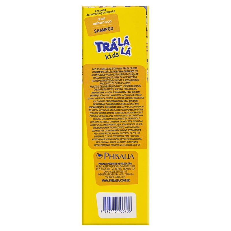 Contém 01 Shampoo Trá Lá Lá Kids Sem Embaraço 480ml. 01 Condicionador Trá Lá Lá Kids Sem Embaraço 480ml. . Kit Trá Lá Lá Sem Embaraço A linha Trá Lá Lá Sem Embaraço, com queratina e agentes desembaraçantes e hidratantes que garantem a limpeza completa e o brilho por mais tempo. Além disso, ainda deixa os cabelos macios e com aquele cheirinho gostoso. Recomendado para todos os tipos de cabelos, Facilitando no Desembaraço. Testado Dermatologicamente. . Modo de Uso Shampoo:Durante o banho, aplique uma quantidade suficiente do Shampoo Trá Lá Lá Kids nos cabelos molhados e massageie até formar espuma. Em seguida, enxágue bem até retirar todo o shampoo. Condicionador:Durante o banho, aplique uma quantidade suficiente do Condicionador Trá Lá Lá nos cabelos molhados e massageie, mas evite passar na raiz. Em seguida, enxágue bem até retirar todo o condicionador. . Benefícios -Não irrita os olhos. -pH balanceado. -Notas de camomila e lavanda. -Perfume delicado e marcante ao mesmo tempo. -Todos os tipos de cabelo. -Testado por dermatologistas. -Rende até 48 banhos.
