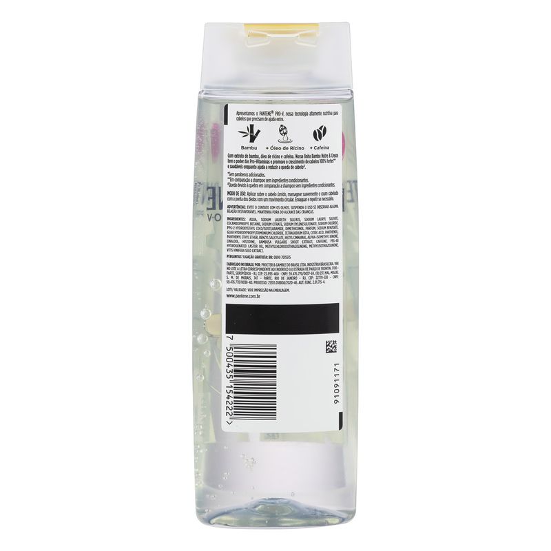O Shampoo Pantene Bambu contém extrato de bambu, óleo de rícino, cafeína e é livre de parabenos*, corantes e óleo mineral. A linha traz toda uma experiencia durante o uso com uma nova fragrância suave e fresca de Pantene.Além de limpar profundamente, protegendo a estrutura do cabelo desde a raiz, evitando a queda.A coleção Pantene Bambu Nutre e Cresce foi criada para ajudar no ciclo da quebra de cabelo, nutrindo desde as raízes, para o cabelo crescer mais forte.Esse Shampoo transparente limpa profundamente ao mesmo tempo que protege a estrutura do cabelo. Com extrato de bambu, óleo de rícino e cafeína. Contém 0% de parabenos, corantes e óleos minerais. O poder de combate à quebra de Pantene Bambu está disponível em produtos de toda a linha, shampoo, condicionador, creme para pentear, máscara nutritiva. Agora, você pode combater a quebra porque um Cabelo Pantene diz meu crescimento não tem limites!· Nutrição desde à raiz, para seu cabelo crescer forte e mais resistente· Ajuda a reduzir a queda de cabelo· O bambu é mais forte que madeira, concreto e aço e pode ser flexível com o vento, sem quebrar· O óleo de rícino, que é rico em ômega 9, tem poder hidratante e pH balanceado· A cafeína, conhecida por promover regeneração celular, também melhora a circulação sanguínea· Uma nova fragrância que transmitirá uma sensação de natureza, com um aroma inspirado nas florestas de bambu· *Queda causada pela quebra dos fios Modo de uso: Aplique sobre o cabelo úmido, massageie suavemente o couro cabeludo com a ponta dos dedos em movimentos circulares. Enxágue e repita se necessário.#html-body [data-pb-style="646BA651C3A64"]{justify-content: flex-start; display: flex; flex-direction: column; background-position: left top; background-size: cover; background-repeat: no-repeat; background-attachment: scroll; border-style: none; border-width: 1px; border-radius: 0px; margin: 0px 0px 10px; padding: 10px;}#html-body [data-pb-style="646BA651C3A79"]{border-style: none; border-width: 1px; border-radius: 0px; margin: 0px; padding: 0px;}