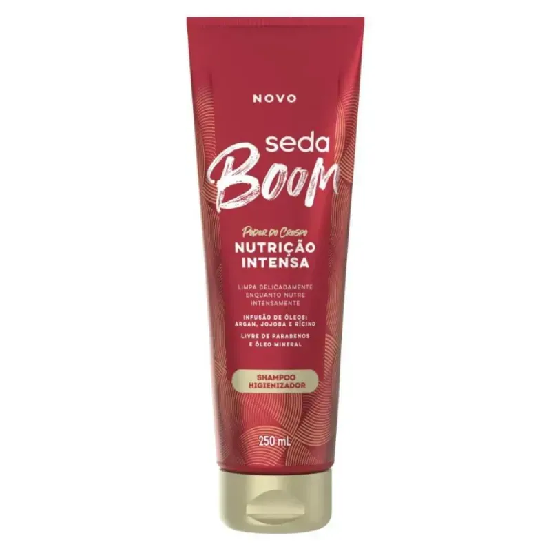 Shampoo Seda Boom Nutrição Intensa 250mlO Shampoo Seda Boom Nutrição Intensa foi desenvolvido especialmente para cabelos crespos que buscam nutrição profunda, maciez e brilho. Sua fórmula avançada combina o poder nutritivo dos óleos de argan, jojoba e rícino, proporcionando hidratação intensa e fortalecimento da fibra capilar. Ideal para uso diário, este shampoo limpa delicadamente enquanto nutre os fios, deixando-os incrivelmente suaves e bem cuidados.Benefícios: