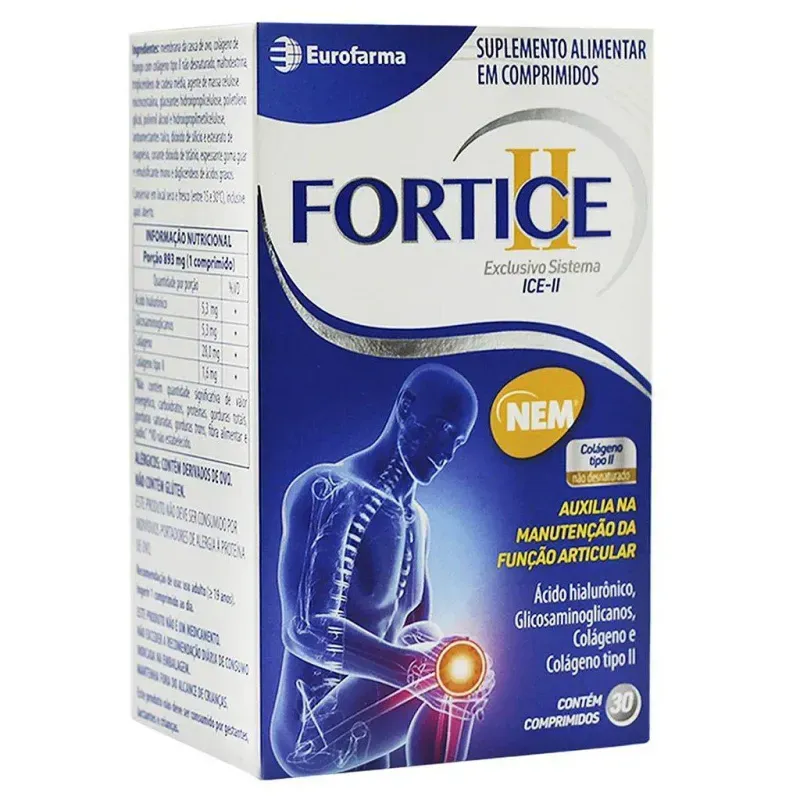O suplemento alimentar Fortice associa a inovadora fonte de Colágeno NEM + Colágeno Tipo II que atuam em sinergismo para um máximo aproveitamento do organismo. PRODUTO GO5715 EAN 7891317007560 QUANTIDADE 30 Comprimidos FABRICANTE Eurofarma MARCA Fortice