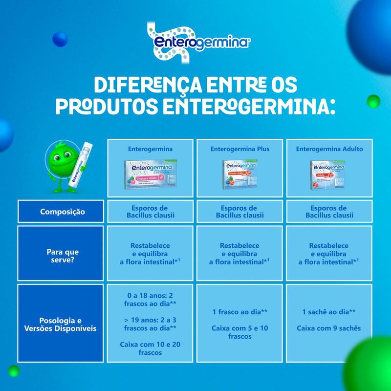 O Enterogermina é um probiótico que contribui para o equilíbrio da flora intestinal, indicado para pessoas com desconforto intestinal.Cada flaconete de 5ml é composto por água e cerca de 2 bilhões de esporos de Bacillus clausii.Microrganismos conhecidos também como bactérias boas, capazes de chegarem vivos no intestino.Lá formam uma barreira protetora contra germes e/ou agentes agressores, restabelecendo o equilíbrio da flora intestinal.O Bacillus clausii ainda é capaz de induzir a produção de vitaminas, principalmente as do complexo B.O consumo de Enterogermina deve estar associado a uma alimentação equilibrada e hábitos de vida saudáveis.Os probióticos são bactérias benéficas que vivem no intestino e auxiliam na saúde geral do organismo.Contèm 20 flaconetes de 5ml.