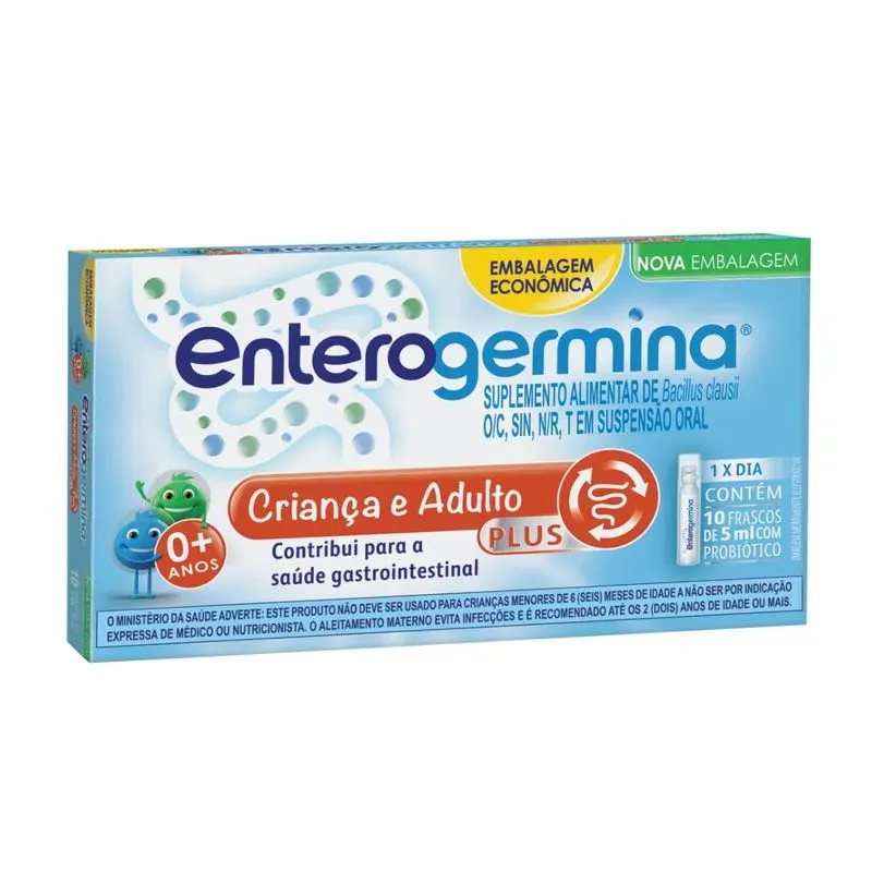 Enterogermina Plus é um probiótico de tripla ação para toda a família: ele equilibra, restaura a flora intestinal e fortalece a defesa.Enterogermina Plus possui formato de flaconete de 5ml, composto por água e cerca de 4 bilhões de esporos de Bacillus clausii.O probiótico vem pronto para consumo, é fácil de tomar e levar, não tem sabor, cheiro, corantes, lactose ou glúten e pode ser utilizado por toda a família.Os esporos do probiótico Bacillus clausii são resistentes ao ácido gástrico, no qual se espalham, promovendo o equilíbrio e restaurando a microbiota intestinal.Basta agitar, abrir e tomar 1 frasco ao dia.Enterogermina é uma solução suave, que não irrita o estomago.