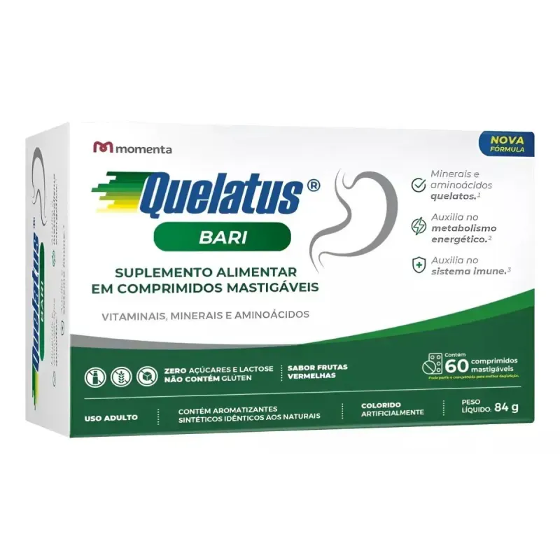Quelatus Bari é um suplemento vitamínico-mineral que ajuda a complementar dietas irregulares ou com falta de algum nutriente.Ele também é indicado para pessoas que fizeram procedimento bariátrico. Quelatos Bari também é importante para metabolizar gorduras, proteínas e carboidratos.Sua fórmula atende as necessidades nutricionais do organismo feminino e masculino e conta com minerais aminoácidos quelatos.Queatos são minerais de última geração desenvolvidos especialmente para nutrição humana e com melhor absorção pelo organismo comparado aos minerais não quelatados.Sua apresentação em comprimidos mastigáveis permite fácil administração, no sabor de frutas vermelhas.