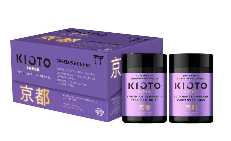 Kioto Super Cabelo e Unha é a dupla perfeita de nutrição e beleza. Este suplemento inovador combina um frasco exclusivo de vitaminas e outro de minerais com ação antioxidante, trabalhando em sinergia para renovar as células desde a raiz.