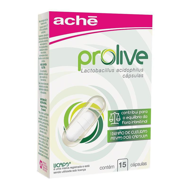 Prolive da Aché é um suplemento probiótico em cápsulas, um alimento funcional indicado para melhorar o funcionamento e o equilíbrio da flora intestinal. Ele tem em sua composição o probiótico Lactobacillus acidophilus LA 14 e a exclusiva tecnologia Licaps, que protege o probiótico, garantindo que ele seja liberado diretamente no intestino, portanto sobrevivendo ao processo digestivo.