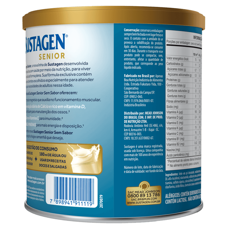 Sustagen Senior Sem Sabor 370g Sustagen Senior foi desenvolvido especialmente para complementar a alimentação e ajudar a atender as principais carências nutricionais de adultos 50+. Sua fórmula é Fonte de Fibras e Proteínas, além de possuir uma combinação única de 26 vitaminas e minerais que auxiliam no metabolismo energético, disposição, imunidade, manutenção dos ossos e funcionamento dos músculos.