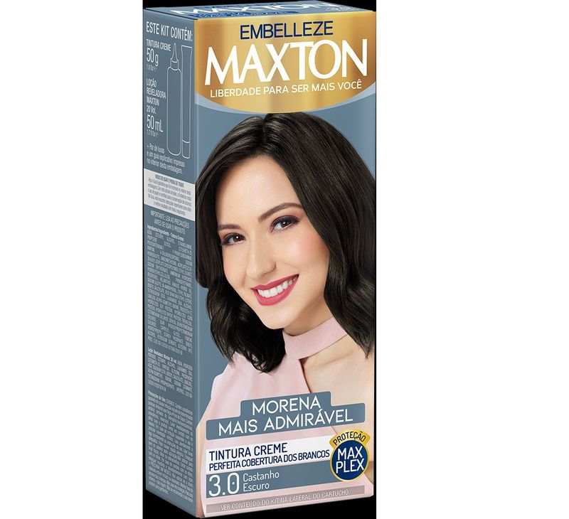 Maxton é a tinta de cabelo que entende sua personalidade e seus desejos, ajudando você a revelar o máximo do seu potencial. Porque só Maxton tem a mais elegante variedade de cores intensas e radiantes, com perfeita cobertura dos fios brancos.A fórmula da tinta de cabelo creme Maxton tem qualidade profissional porque foi desenvolvida utilizando-se um mix equilibrado de moléculas especiais. Este poderoso equilíbrio proporciona tons luminosos e uma cobertura perfeita dos fios brancos. Contém uma exclusiva combinação de polímeros de alto e baixo peso molecular que permitem uma maior aderência e total afinidade do produto aos fios e, como resultado, uma uniformidade da cor da raiz às pontas. Modo de Uso:Coloque a tinta no frasco aplicador e agite bem até ficar homogêneo. Separe o cabelo e aplique da raiz às pontas e espalhe uniformemente em todo o cabelo (aplique a tinta com o cabelo seco). Retire o produto após 35 ou 40 minutos da aplicação.