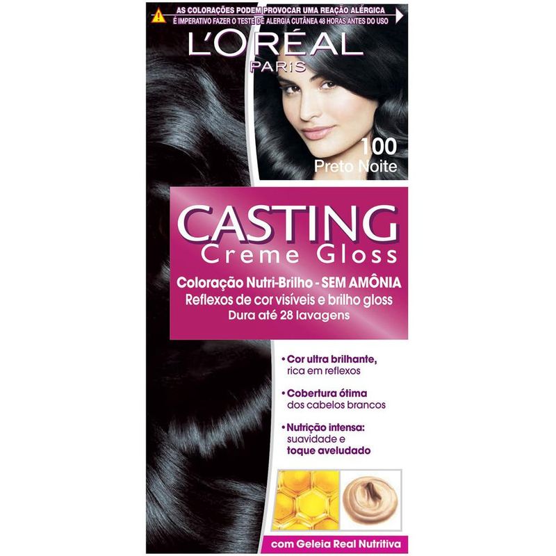 TINTURA SEMI-PERMANENTE CASTING CREME GLOSS 100 PRETO NOITECasting Creme Gloss é a coloração sem amônia de L'Óreal Paris que garante 4 vezes mais brilho gloss para os fios. Casting Creme Gloss pode ser usado até em cabelos com química.Durante a coloração, sua exclusiva fórmula reforça a fibra capilar, deixando seus fios mais macios com um toque aveludado, sem ressecamento.USO: Misture o creme colorante com o revelador e misture bem. Aplique a coloração por todo o cabelo, indo das raiz até as pontas. Use um pincel para espalhar bem o produto. Deixe o produto agir por aproximadamente 20 minutos, de acordo com as instruções da embalagem. Enxágue o cabelo em água corrente para retirar todo o produto. Com os cabelos úmidos, aplique o condicionador de tratamento Nutri-Brilho, para deixar os fios macios e brilhosos.