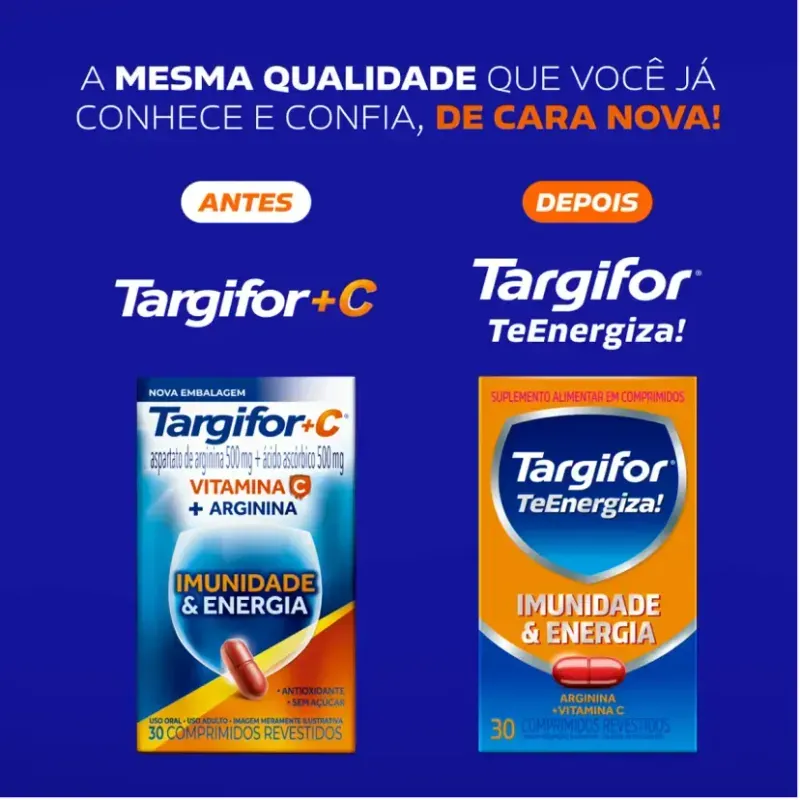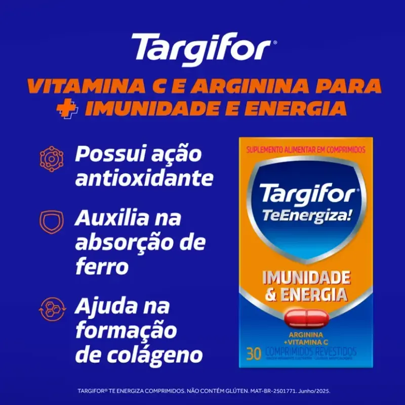 Com fórmula composta por 500mg de aspartato de arginina e 500mg de vitamina C por comprimido, Vitamina C + Arginina Targifor TeEnergiza! atua diretamente na geração de energia e na eliminação de toxinas associadas ao cansaço, graças à ação do aspartato de arginina. Já a vitamina C age como antioxidante, contribuindo para a proteção imunológica.
