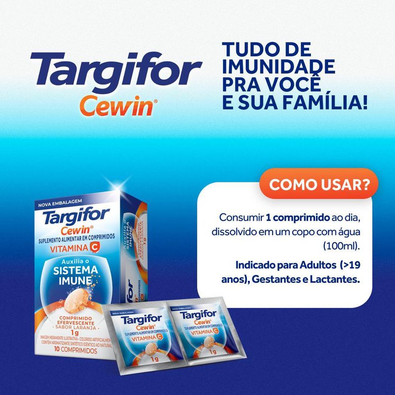 Dissolva 1 comprimido efervescente de Vitamina C Efervescente Targifor TeProtege Imunidade em um copo de água (aproximadamente 200 ml) e consuma imediatamente após o preparo.