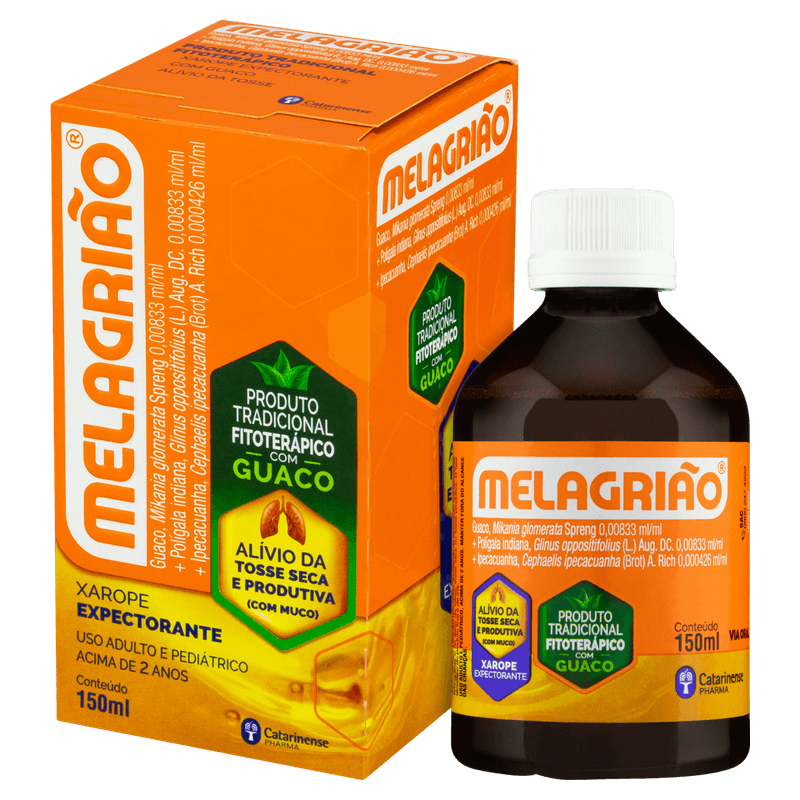 Xarope Melagrião 150ml - Catarinense  O Melagrião Xarope age no tratamento de doenças do trato respiratório, promovendo o relaxamento da musculatura lisa dos brônquios e tem ativos  que auxiliam na eliminação das secreções brônquicas. Ou seja, para tosses secas ou produtivas, Melagrião.  Composição: Lactase de Aspergillus oryzae, estabilizantes celulose microcristalina, polivinilpirrolidona insolúvel e croscamelose sódica, antiumectante Composição: Cada ml do produto contém: 0,00833ml de Ext. fl. de guaco, 0,00833 ml de Ext. fl. de polígala, 0,00042ml de Ext. fl. de ipecacuanha. Excipientes: alcoolatura de agrião, soluto concentrado de bálsamo de tolu, extrato fluido de acônito, sacarose, mel, álcool etílico, benzoato de sódio, metilparabeno e água purificada.  Imagens Meramente Ilustrativas. Todas as Informações Divulgadas são de Responsabilidade Exclusiva do Fabricante/fornecedor.